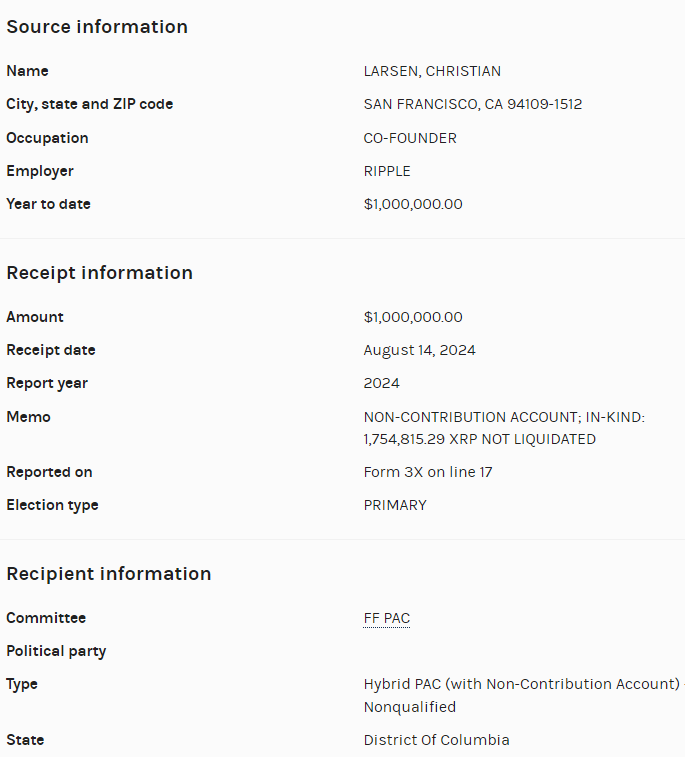 Volgens gegevens van de Federal Election Commission (FEC) heeft Chris Larsen op 14 augustus 1,7 miljoen XRP-tokens, met een waarde van ongeveer $1 miljoen, gedoneerd aan het pro-Harris Future Forward PAC. Dit politieke actiecomité ondersteunt Kamala Harris door middel van campagnereclame en richt zich op haar tegenstanders, waaronder Donald Trump.