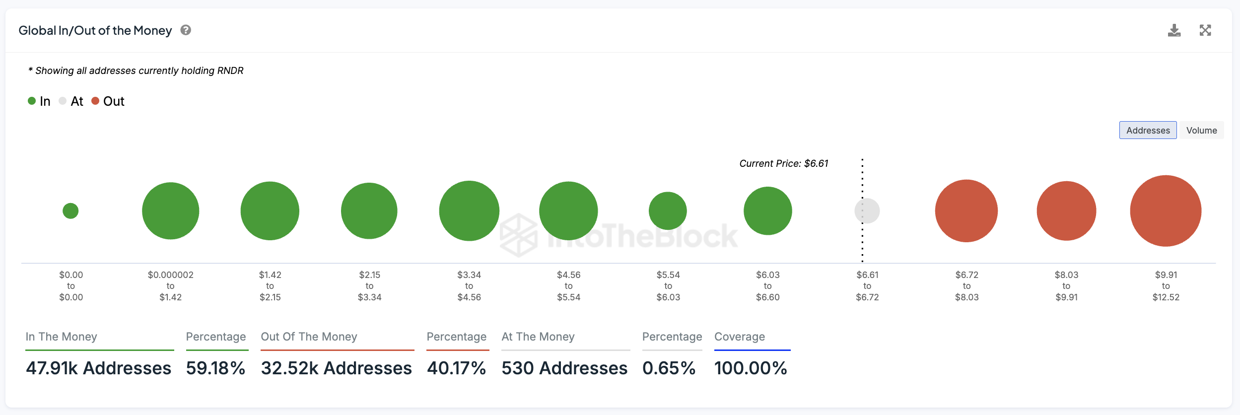 De RNDR Global In/Out of the Money (GIOM) indicator wijst op sterke weerstandsniveaus in de $6,72 tot $8 range. Dit duidt erop dat een aanzienlijk aantal RNDR-houders tegen deze koersniveaus heeft gekocht. Hierdoor kan er potentiële verkoopdruk ontstaan zodra de koers deze punten nadert.