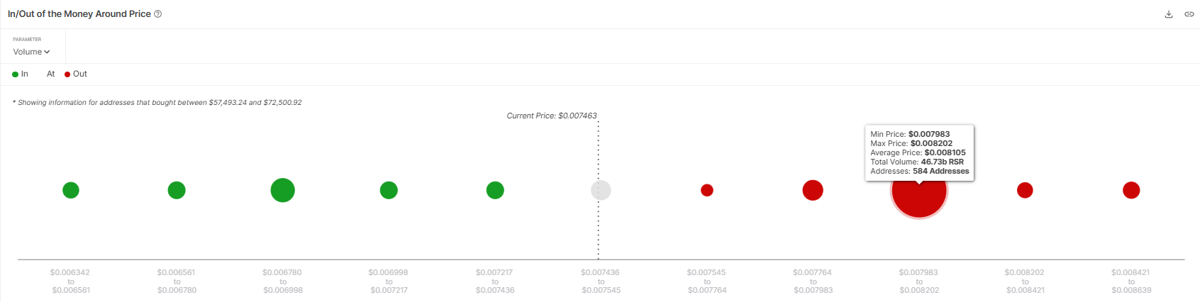 Het marktsentiment rond RSR blijft voorzichtig optimistisch, gedreven door een sterke accumulatie van tokens. Volgens de IOMAP zitten er momenteel ongeveer 46,73 miljard RSR tokens, ter waarde van meer dan $350 miljoen, in een koersrange tussen $0,007983 en $0,008202.