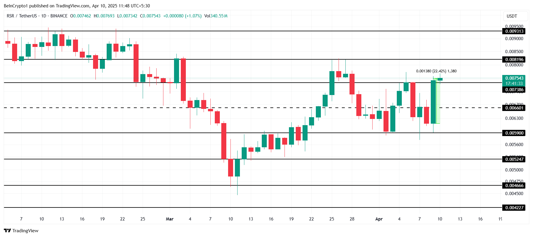 De Reserve Rights (RSR) koers handelt momenteel op $0,007543, met een sterk steunniveau op $0,007386. Gezien de 22% stijging in de afgelopen 24 uur is het mogelijk dat de token blijft stijgen als het boven deze steun blijft.