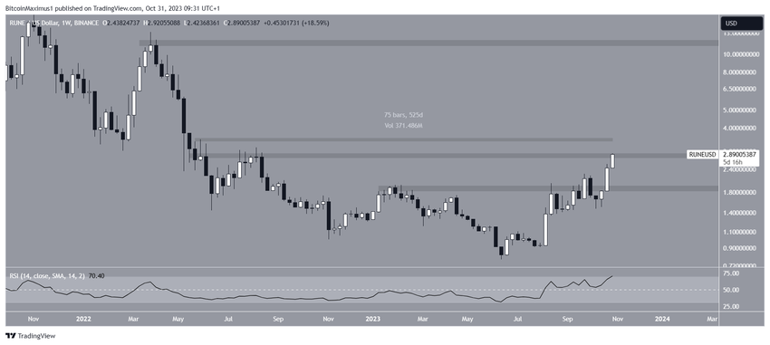 Dit is een cruciaal gebied, omdat de RUNE koers er al 525 dagen niet boven is gesloten. Bovendien is er een gebrek aan weerstand als de altcoin uitbreekt.