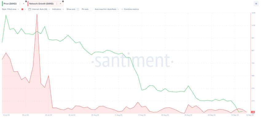 De dagelijkse Network Growth grafiek hieronder laat zien dat Sandbox deze maand nog geen 200 nieuwe portemonneeadressen heeft geregistreerd. Bij het sluiten van 13 september werden slechts 146 nieuwe portemonneeadressen aangemaakt op het Sandbox netwerk, een daling van 37% ten opzichte van de 231 adressen die werden geregistreerd op 29 augustus toen de prijs kortstondig $0,35 opnieuw testte.