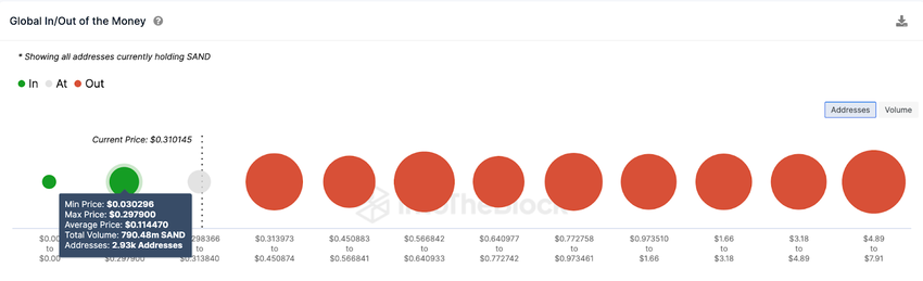 De Global In/Out of the Money (GIOM) gegevens, die de prijsverdeling van de huidige SAND houders laten zien, bevestigen ook deze voorspelling.