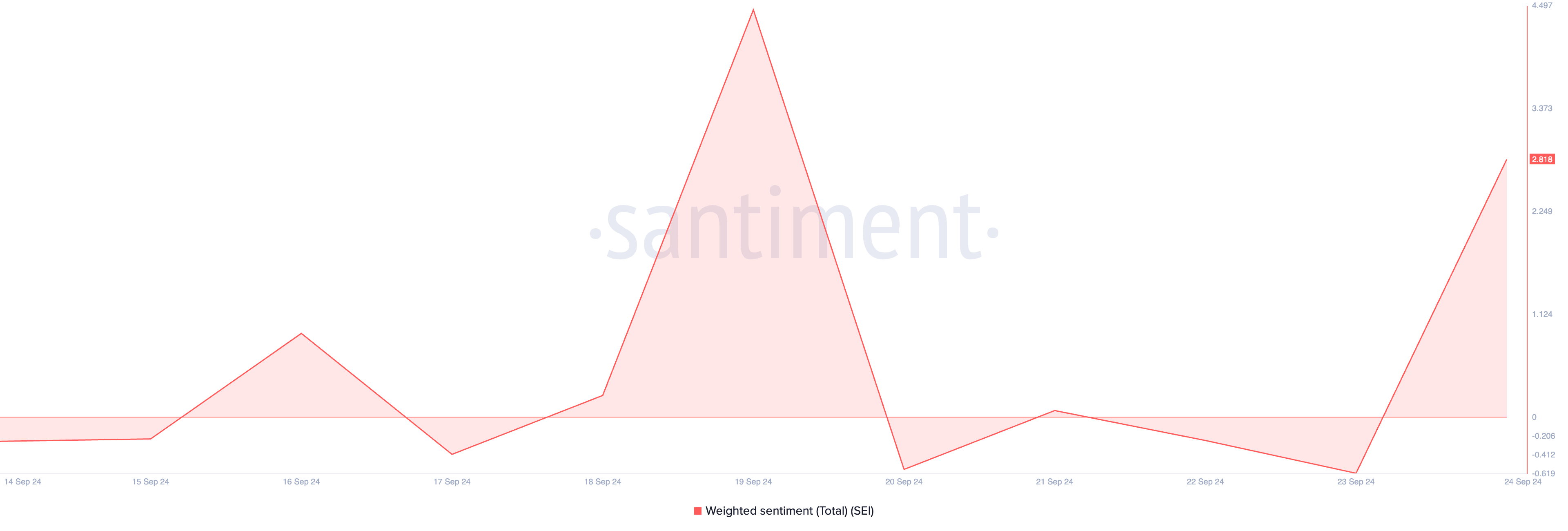 Daarnaast versterkt dit de positieve vooruitzichten voor SEI, ondersteund door het gewogen sentiment, dat het algemene marktsentiment ten opzichte van de altcoin meet. Volgens Santiment staat SEI’s gewogen sentiment op 2,81, wat aangeeft dat positieve emoties de overhand hebben in de discussies op sociale media over de coin.