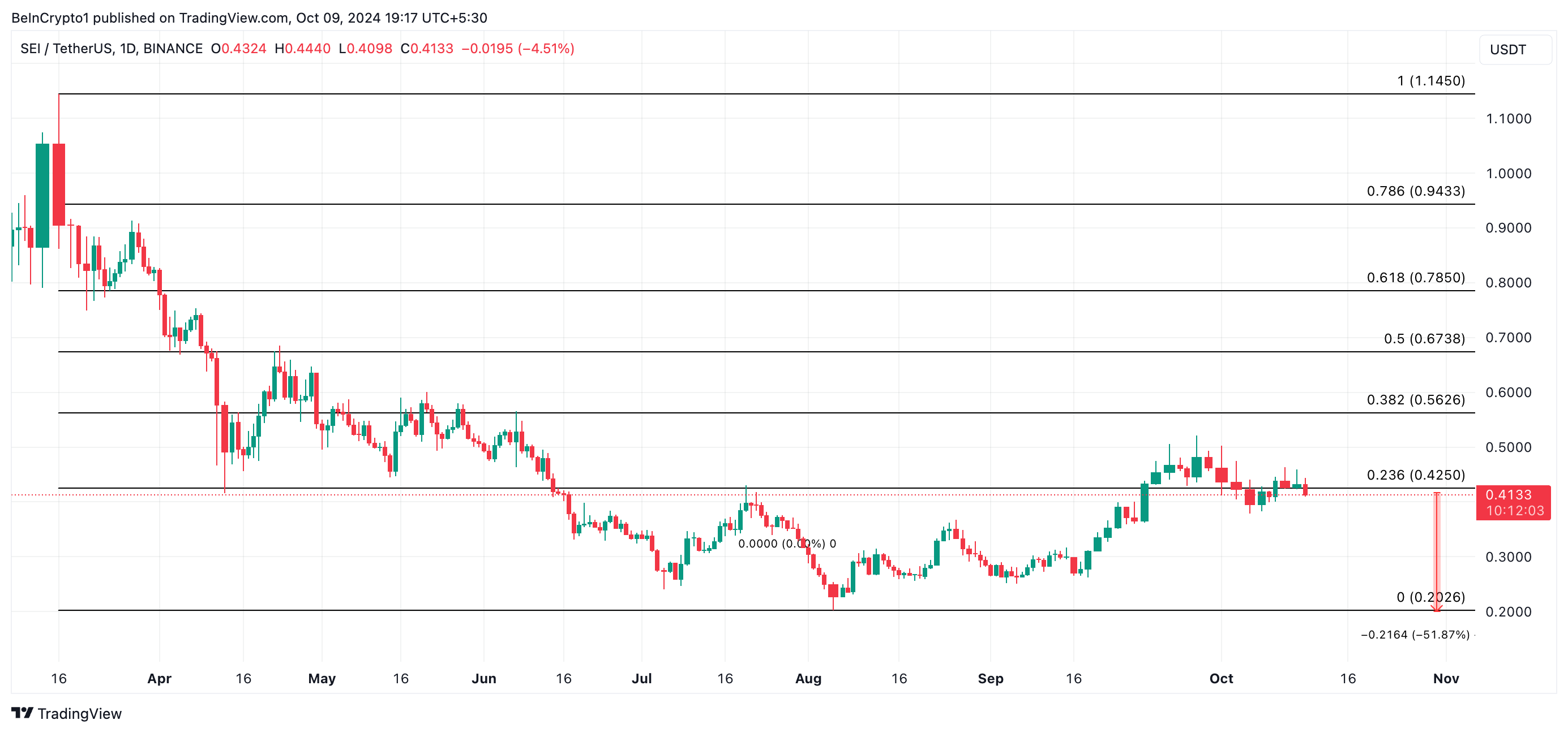 Lezingen van SEI’s Fibonacci Retracement-tool suggereren dat als de neerwaartse trend aanhoudt, het volgende koersdoel de jaarlijkse low van 5 augustus is, op $0,20. Dit vertegenwoordigt een daling van 52% ten opzichte van de huidige waarde.