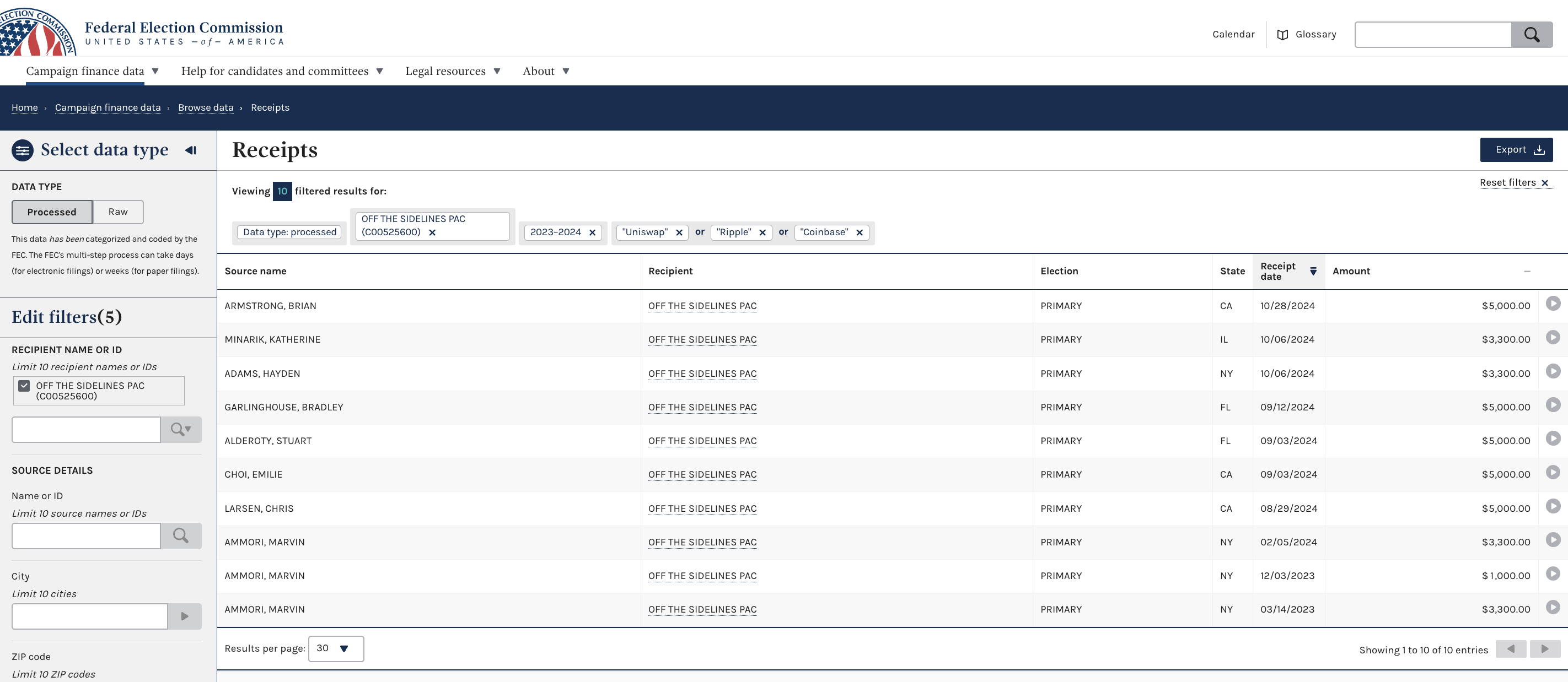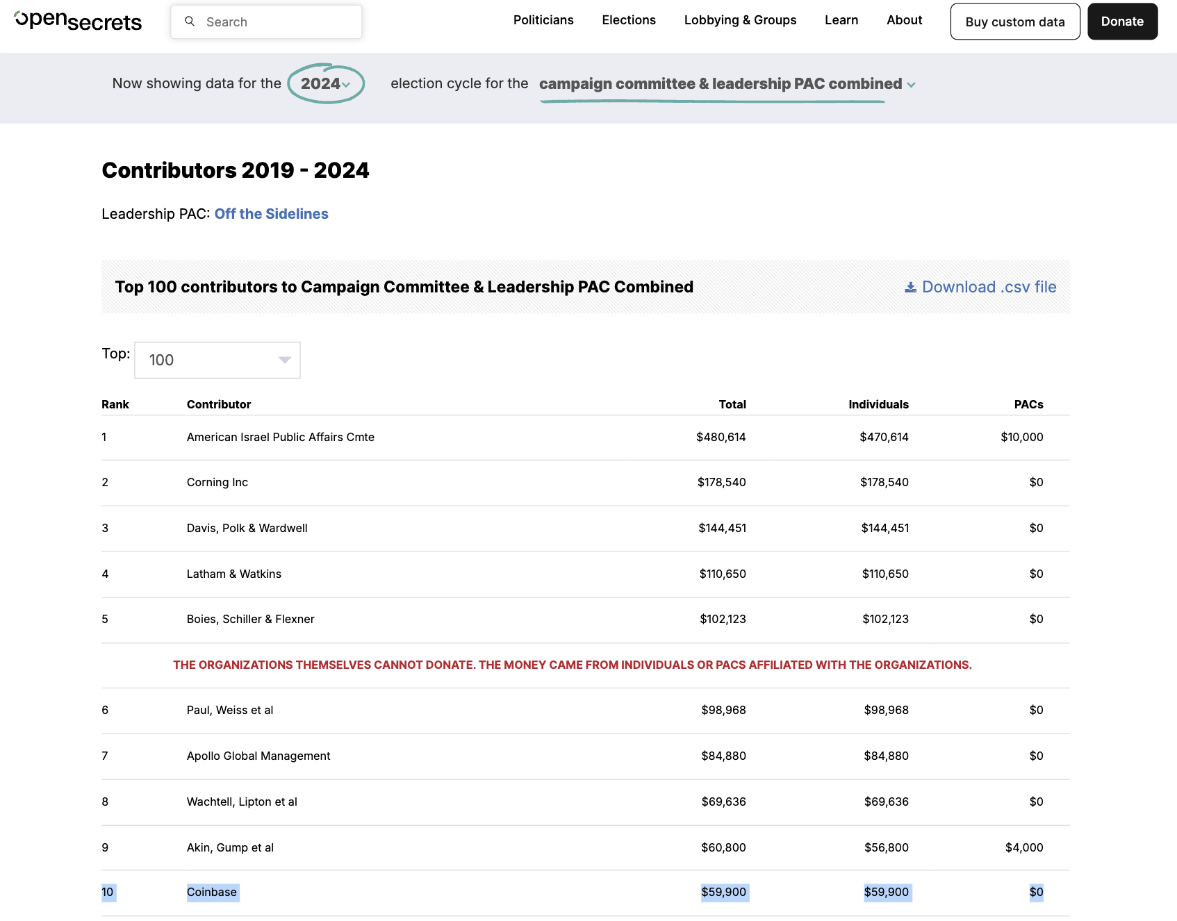 Gezien deze informatie waren bijdragers die verbonden zijn aan Coinbase in 2024 de tiende grootste bedrijfsdonoren aan Off the Sidelines, het leiderschap PAC van Senator Gillibrand. Samen doneerden ze $59.900 aan haar herverkiezingscampagne.