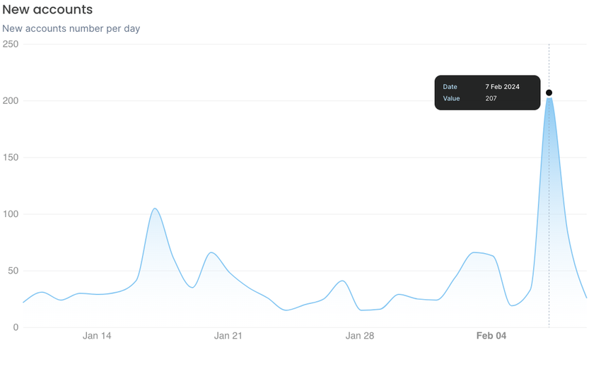 Meer positief on-chain nieuws is de toename van nieuwe inschrijvingen op het SHIB Web3 blockchain ecosysteem, Shibarium. Tussen 6 en 7 februari 2024 steeg het aantal nieuwe accounts van 33 naar 207, volgens Shibariumscan. Bij het ter perse gaan stond het aantal accounts op 63.661.
