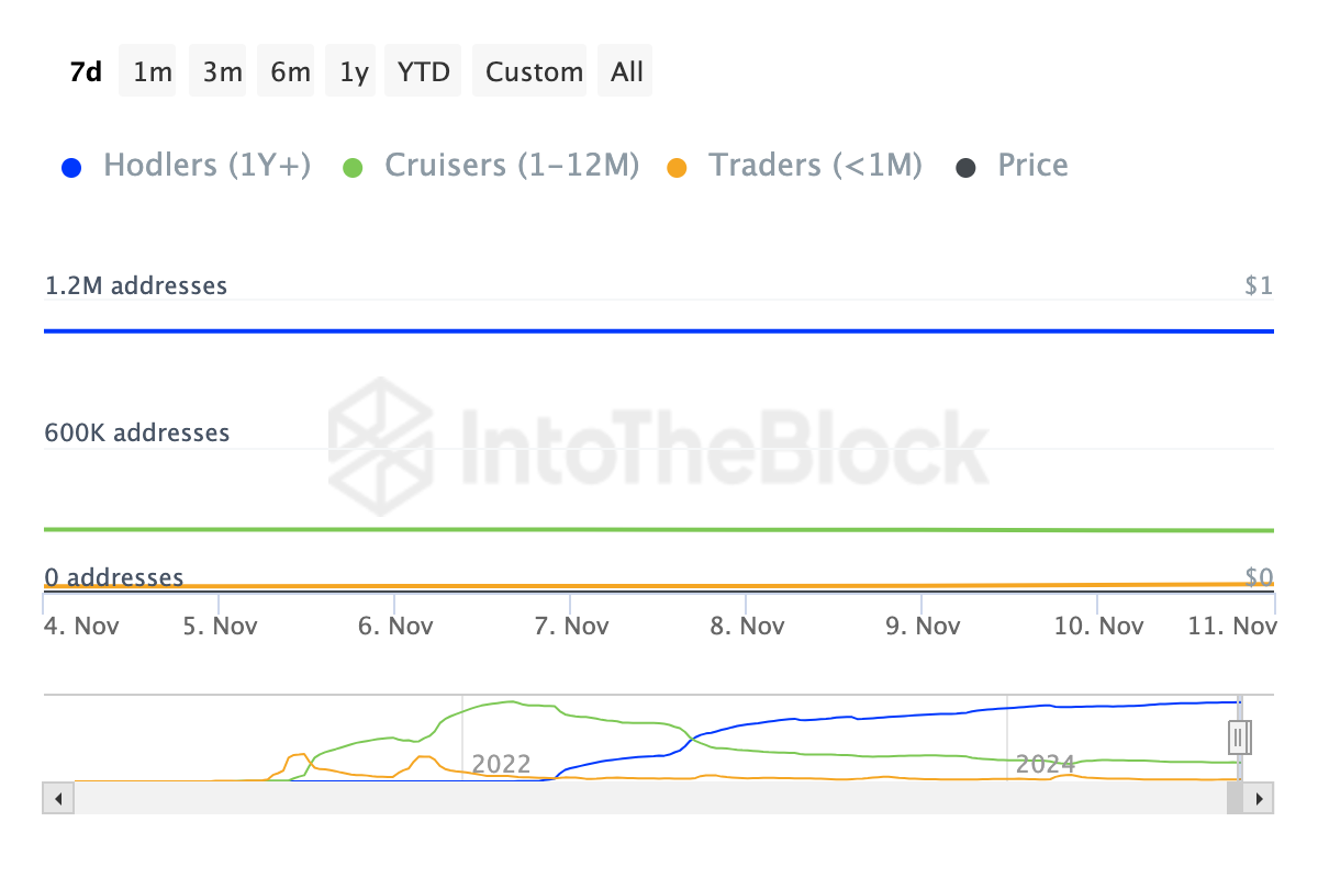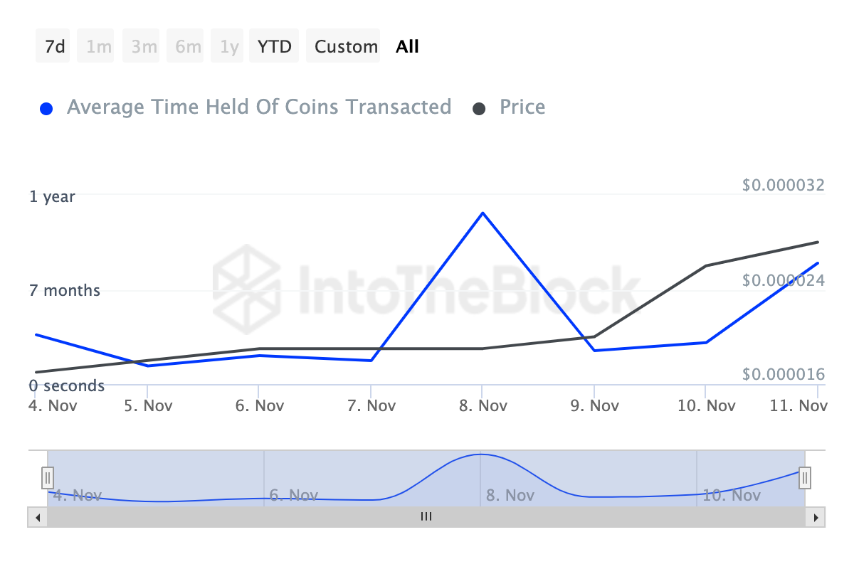 Hoewel sommige andere cryptovaluta kunnen dalen door verkoopdruk, toont de Coin Holding Time-metriek aan dat SHIB-houders zich onthouden van neerwaartse druk uitoefenen op de token. Deze metriek meet hoe lang een coin wordt vastgehouden zonder te worden verhandeld of mogelijk verkocht.