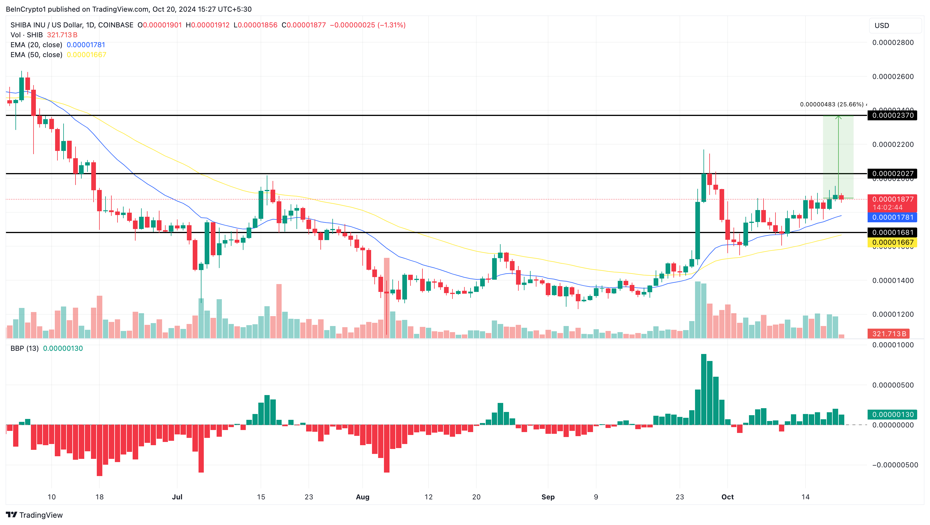 Dit werd verder versterkt door de Exponential Moving Average (EMA). Zoals hieronder te zien is, ligt de 20 EMA (blauw) boven de 50 EMA (geel), wat een bullish trend aangeeft. Mocht deze trend doorgaan, dan kan de koers van SHIB stijgen naar $0,000024.