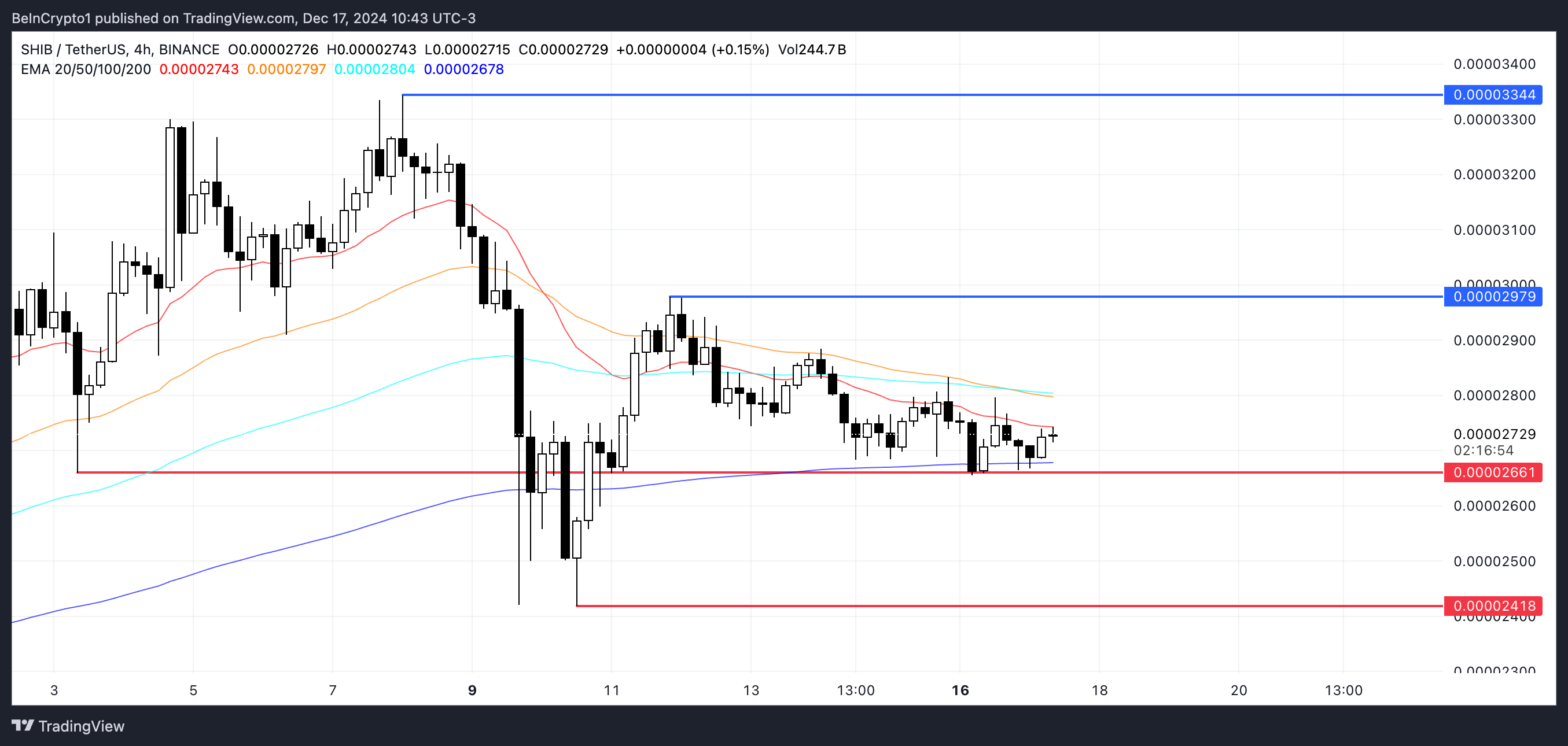 De Shiba Inu koers heeft momenteel een sterk steunniveau rond $0,0000266, maar als dit niveau faalt, kan de koers dalen naar $0,0000241.