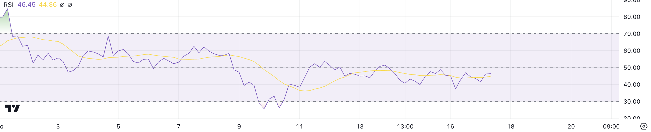 Wanneer de RSI tussen 30 en 70 ligt, weerspiegelt dit meestal een gebalanceerde markt, waar noch kopers noch verkopers domineren.