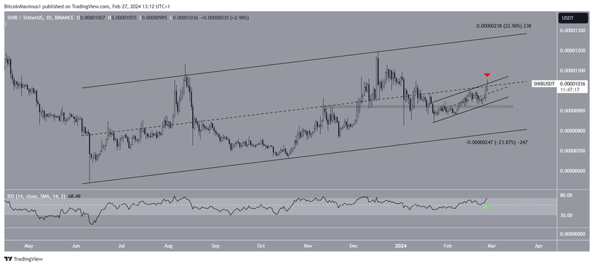 De koersactie laat zien dat SHIB handelt binnen een stijgend parallel kanaal op de lange en korte termijn. Het probeert momenteel uit te breken uit het midden van het lange termijn kanaal en de weerstand van het korte termijn kanaal (rode pijl).