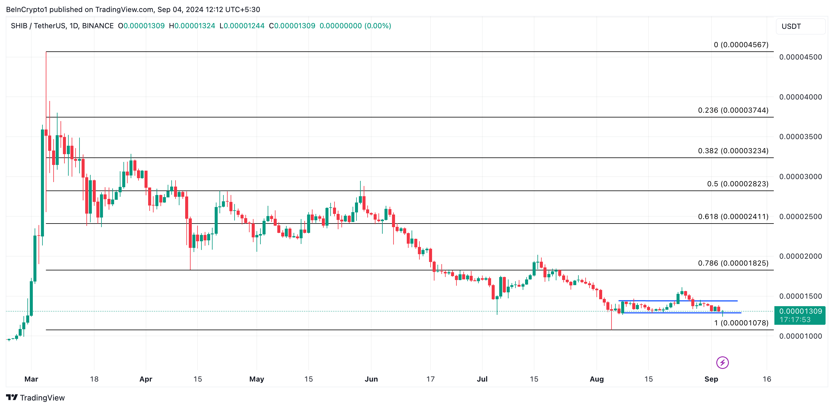 Shiba Inu (SHIB), een toonaangevende meme coin, beweegt sinds 8 augustus in een horizontaal bereik. Ondanks een tijdelijke stijging boven de bovengrens, viel het op 28 augustus terug onder de weerstand.