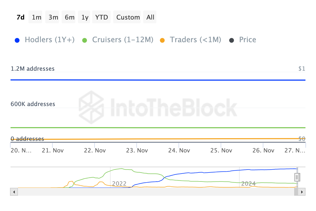 Bovendien toont data van IntoTheBlock aan dat verschillende kortetermijn SHIB houders hebben afgezien van het verkopen van de token in de afgelopen 30 dagen. Deze data is volgens de Balance by Time Held.