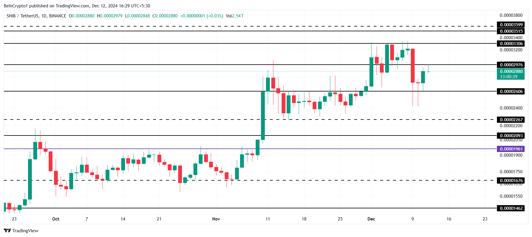 Als het momentum toeneemt, zou SHIB zijn positie kunnen herwinnen en zich richten op de volgende weerstand op $0,00003306. Dit zou een significante herstel voor de meme coin betekenen.