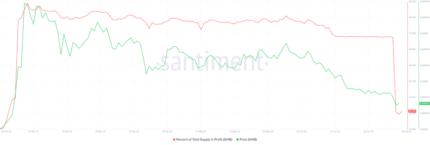 Terwijl de koers van Shiba Inu de afgelopen week slechts met 15% daalde, was de impact voor investeerders drie keer zo groot. Het totale aanbod in de winst daalde met sluiting 42%, van 75% naar 33% in één dag.