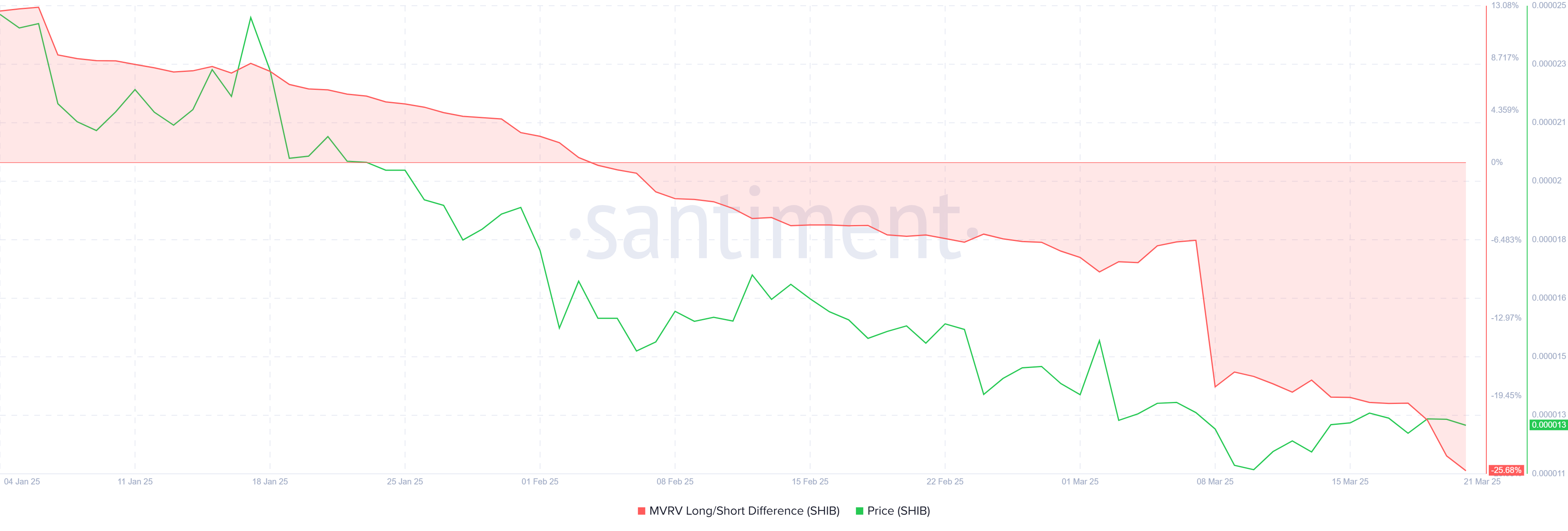 Het macro-momentum van Shiba Inu vertoont ook tekenen van zwakte. De MVRV Long/Short Difference indicator, die de winstniveaus van korte-termijn houders (STH’s) versus lange-termijn houders meet, suggereert dat STH’s domineren in termen van winst.