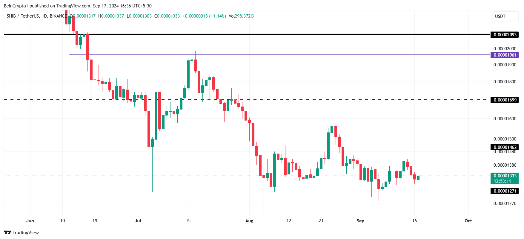 De koers van Shiba Inu (SHIB) beweegt zijwaarts, fluctuerend tussen $0,00001462 en $0,00001271 gedurende de afgelopen weken. De altcoin zit vast in dit bereik sinds begin augustus, op zoek naar bullish signalen om los te breken en omhoog te stijgen.