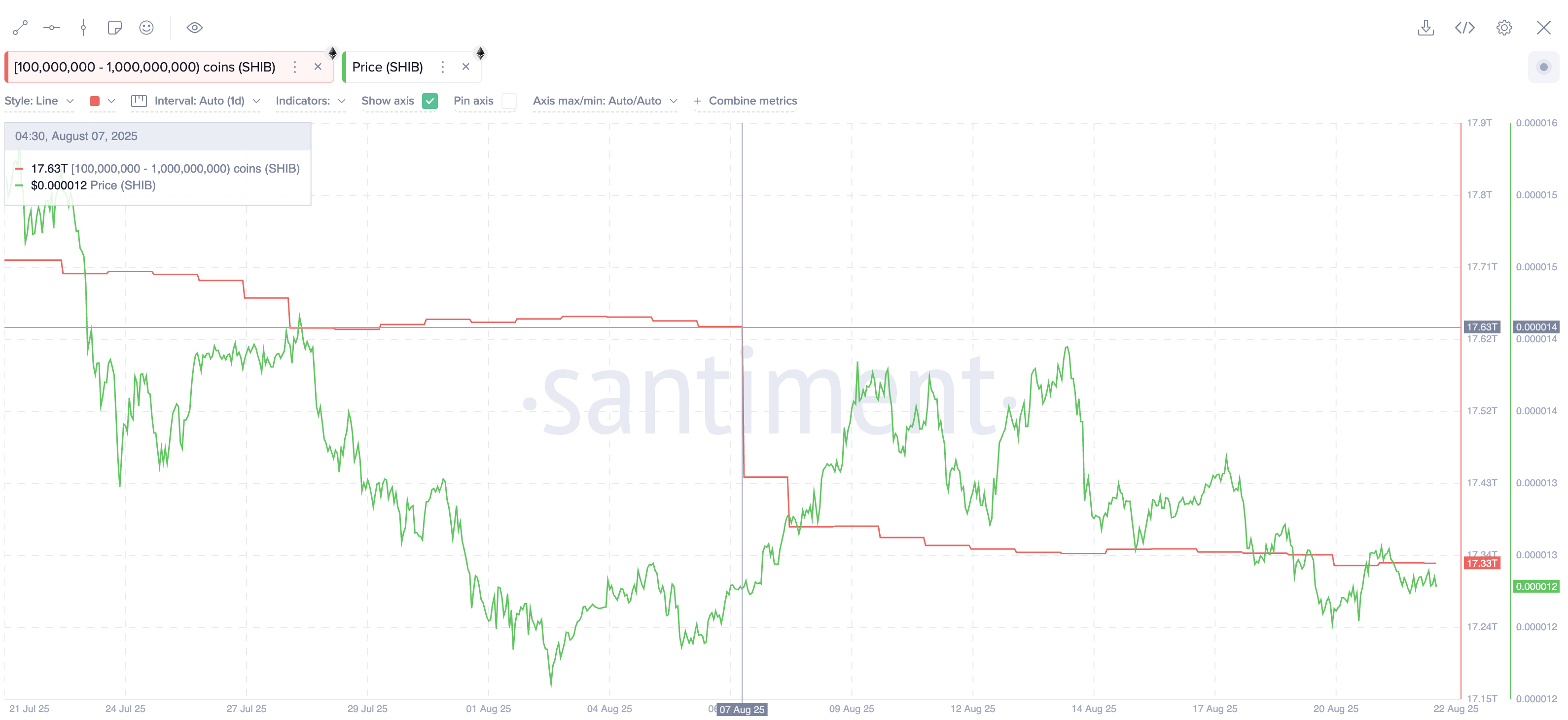 Wallets met tussen de 100 miljoen en 1 miljard SHIB hebben hun posities verminderd. Op 21 juli hadden ze 17,72 biljoen SHIB. Op 28 juli was dat gedaald naar 17,63 biljoen SHIB. Zelfs die kleine vermindering veroorzaakte een scherpe koersdaling, waarbij de SHIB koers daalde van $0,000014 naar $0,000012 (een daling van 14,29%) op 2 augustus.