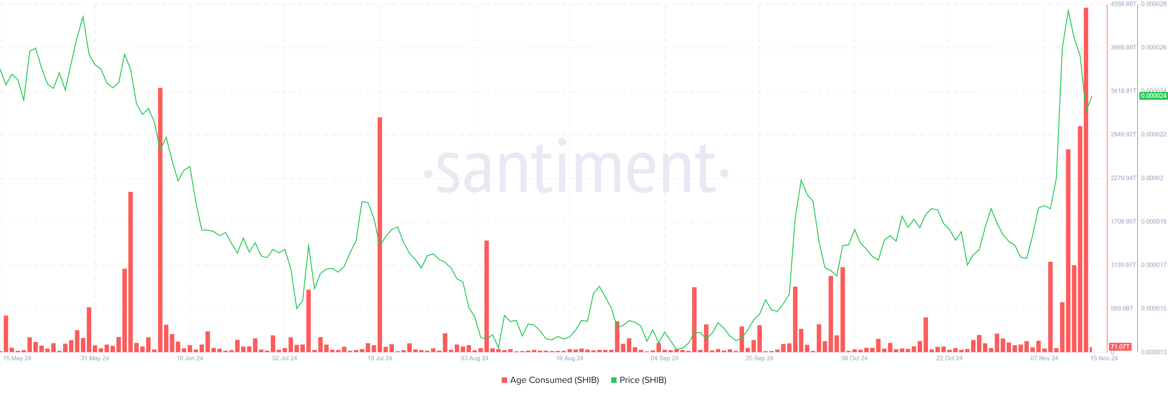 In de afgelopen 24 uur heeft de “age consumed” metriek van Shiba Inu—een belangrijke indicator voor het volgen van de beweging van lang vastgehouden coins—zijn hoogste niveau bereikt sinds maart. Deze piek in activiteit duidt op de grootste verschuiving van door LTH’s gehouden SHIB-tokens in de laatste acht maanden. LTH’s, die doorgaans de ruggengraat vormen van de marktstabiliteit van een activum, hebben hun tokens meer dan gebruikelijk verplaatst.