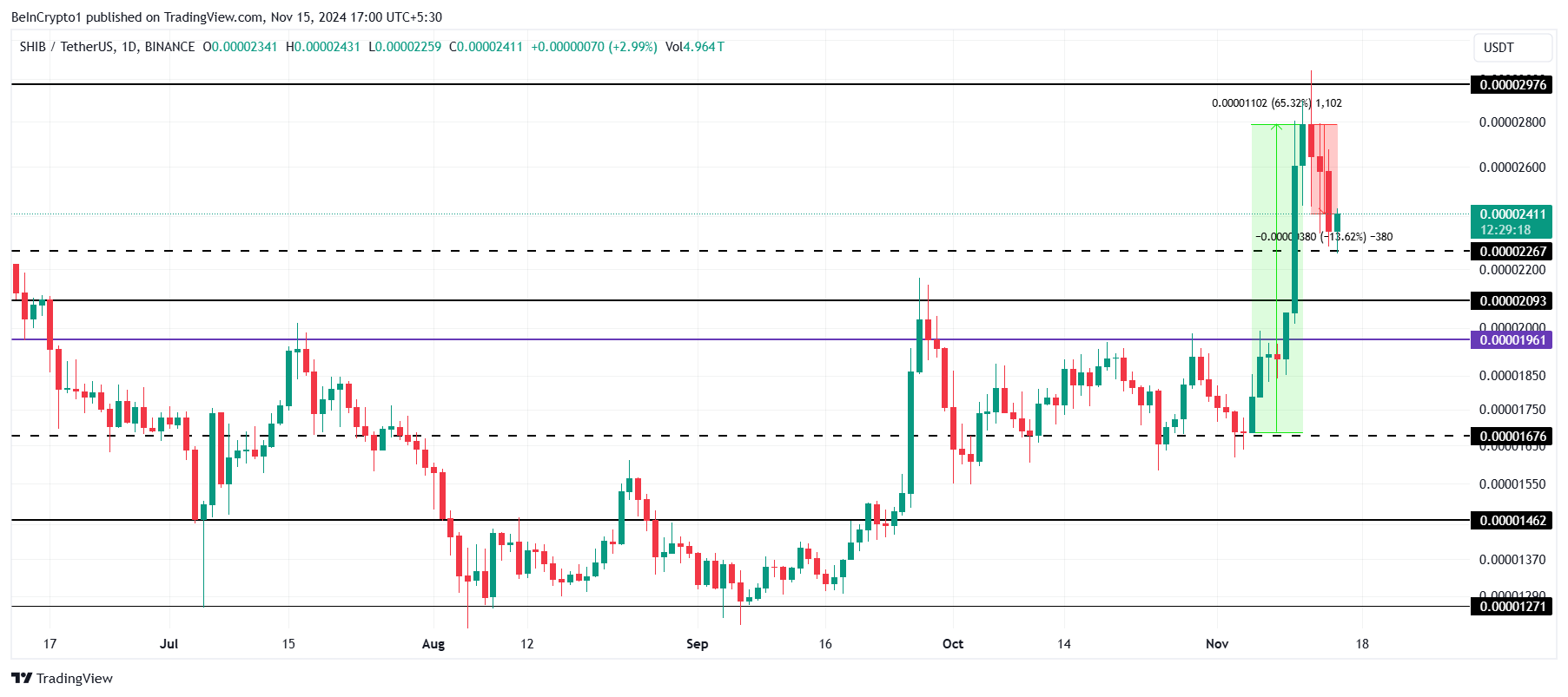 De koers van Shiba Inu (SHIB) heeft de afgelopen week een opmerkelijke stijging van 65% doorgemaakt, wat aanzienlijke aandacht heeft getrokken van zowel particuliere als institutionele investeerders. Echter, na deze rally heeft SHIB een scherpe terugval gezien, waardoor het op een kritiek steunniveau van $0,00002411 is beland.