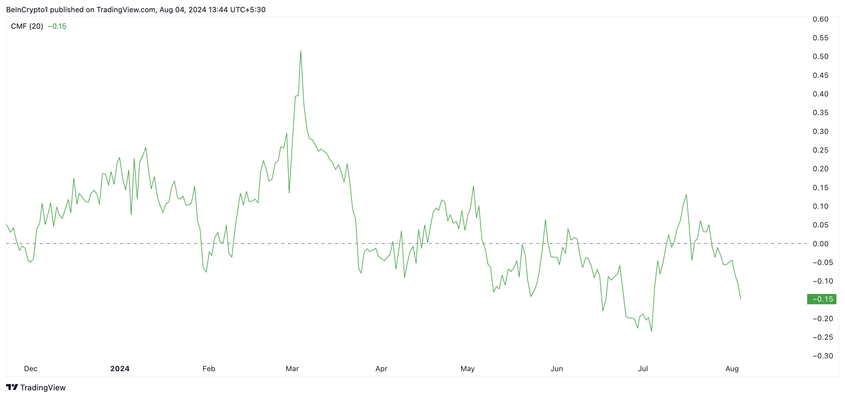 Echter, metingen van andere indicatoren signaleren dat het herstel mogelijk niet op korte termijn zal plaatsvinden. Bijvoorbeeld, de koersdaling van SHIB gaat gepaard met een dalende Chaikin Money Flow (CMF). Op dit moment is de CMF van SHIB onder nul op -0.15 en in een dalende trend.
