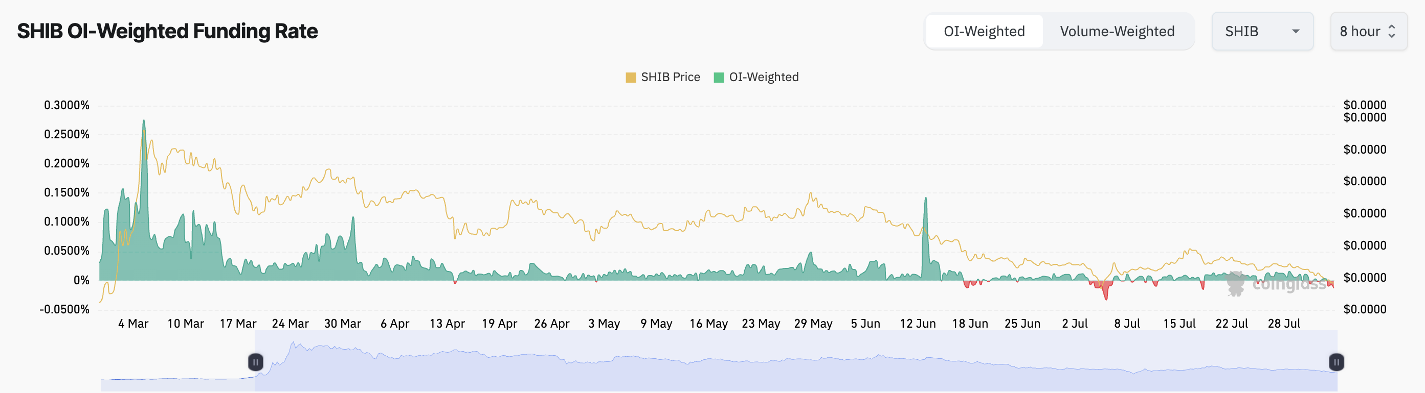 Volgens Coinglass is de open interest in SHIB-futures $26 miljoen. Het is consistent gedaald sinds 19 juli, met een daling van 51% in de afgelopen 16 dagen.