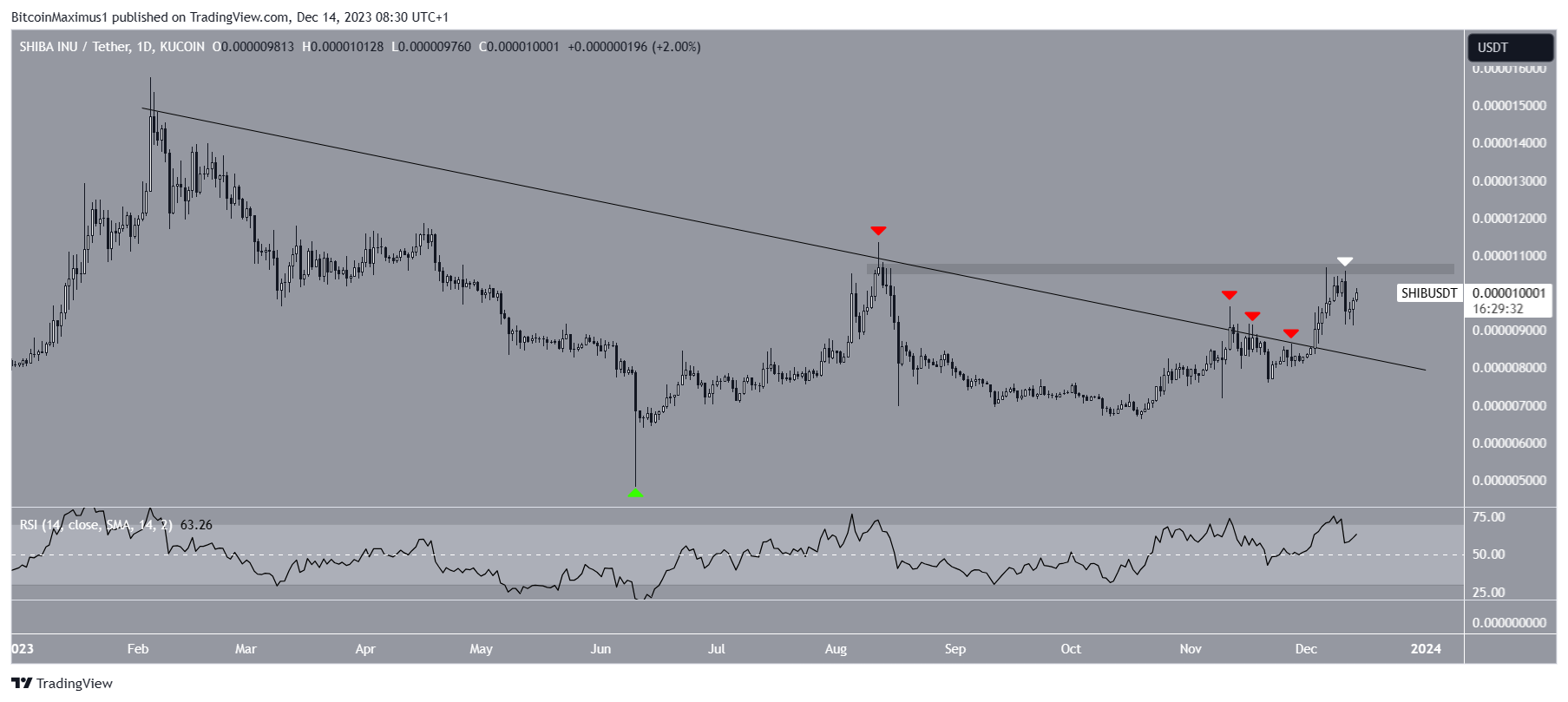 Ondanks vier mislukte breakout-pogingen (rode pijlen) brak de SHIB koers uit de trendlijn op 3 december.