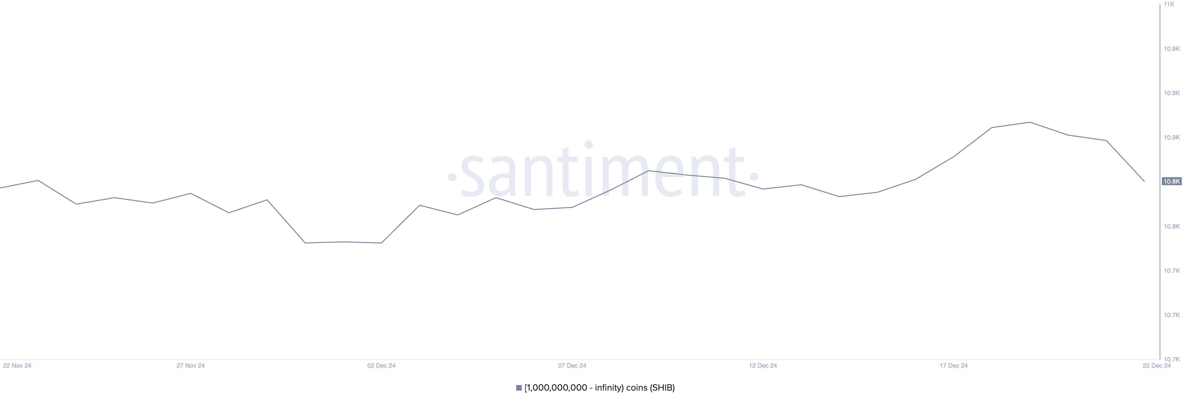 Het aantal Shiba Inu whales dat minstens 1 miljard tokens bezit, is gestegen tussen 14 december en 19 december, met adressen die toenamen van 10.861 naar 10.930.
