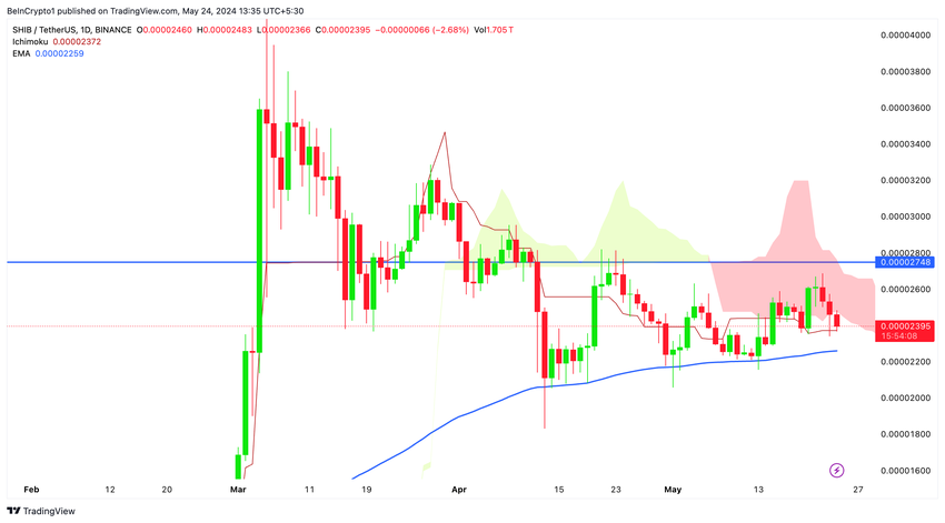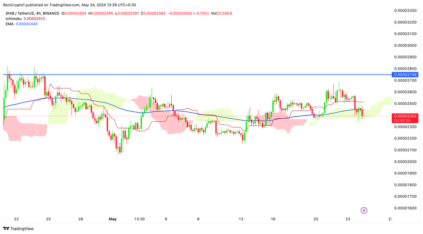 Laten we ons eens verdiepen in de koersactie van Shiba Inu (SHIB) op het dagelijkse en het vier-uur durende timeframe. Op dit moment handelt SHIB op $0,00002393.De koers is er niet in geslaagd de dagelijkse Ichimoku-wolk opwaarts te openen, wat een belangrijk steunniveau is.