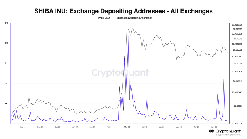 De grafiek toont een sterke piek in het aantal exchange depositing adressen eind mei. Deze plotse stijging suggereert dat veel SHIB holders hun tokens naar exchanges overbrengen.