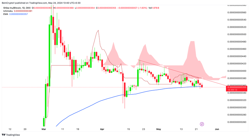 De koers nadert nu een steunniveau op middellange termijn, weergegeven door het rode Tenkan-sen plateau op de grafiek. De 100 EMA (Exponential Moving Average) op het dagelijkse tijdframe dient als een cruciaal steunniveau op middellange termijn voor de koers van SHIB.