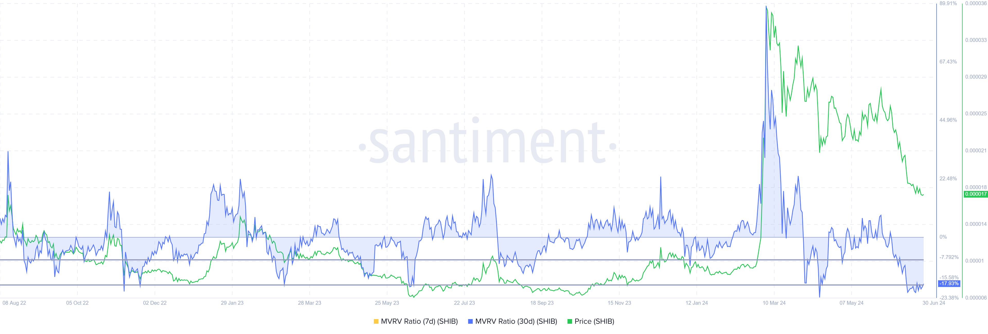 De MVRV-ratio beoordeelt de winst en het verlies van investeerders. Momenteel staat de 30-daagse MVRV van Shiba Inu op -17%, wat wijst op verliezen die kunnen leiden tot koopdruk. Historisch gezien duidt de MVRV van SHIB tussen -8% en -18% meestal op het begin van herstel en rally’s, wat een kanszone markeert voor accumulatie.