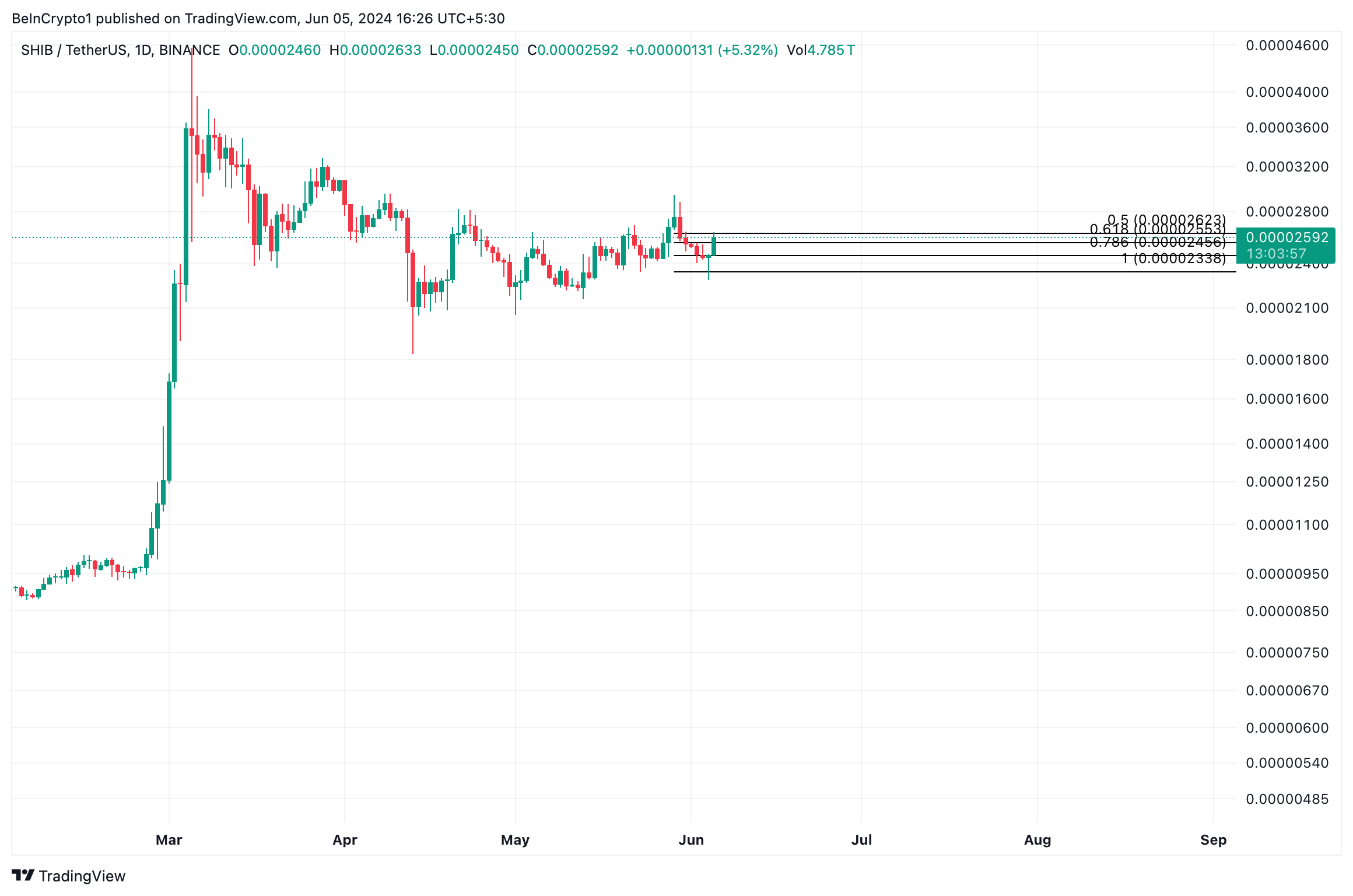 Ook de Moving Average Convergence Divergence (MACD) indicator van SHIB toonde een opwaartse kruising van de signaallijn (rood) met de MACD-lijn (blauw) op 2 juni. Deze kruising is een bearish signaal, wat suggereert dat het kortetermijngemiddelde van SHIB onder het langetermijngemiddelde is gezakt.