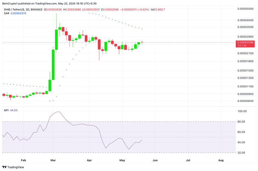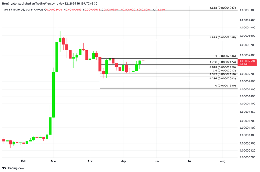 Een beoordeling van de koersbewegingen van de coin op een 3-daagse grafiek onthulde dat deze sinds 12 april binnen een parallelkanaalpatroon is getrend, waarbij weerstand werd waargenomen op $0,000027 en steun werd gevonden op $0,00002.