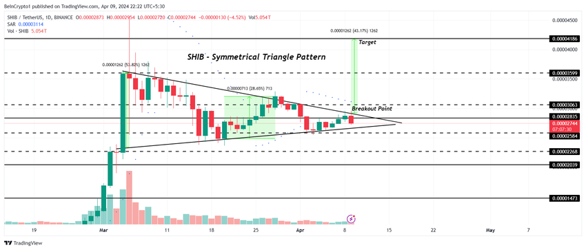 Dekoers van Shiba Inu bevindt zich op het moment van schrijven in een symmetrisch driehoekspatroon en wisselt van eigenaar op $0,00002744. Een symmetrisch driehoekspatroon wordt gevormd door convergerende trendlijnen en geeft een periode van consolidatie aan. Het wijst meestal op een opwaartse of neerwaartse breakout, wat een mogelijke voortzetting van de vorige trend aangeeft.