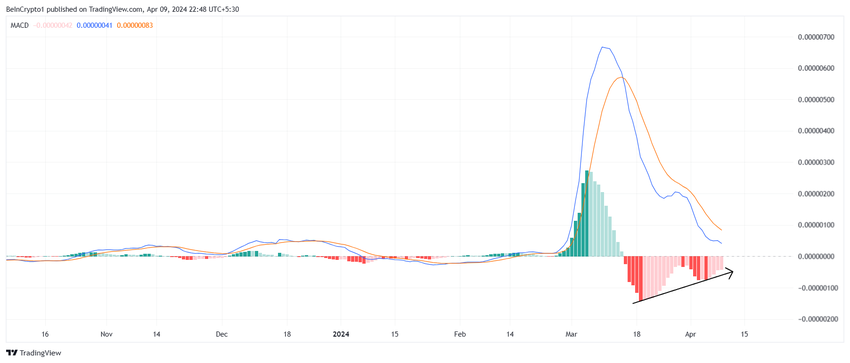 Dekoers van Shiba Inu handelt momenteel binnen een symmetrisch driehoekspatroon, geholpen door steeds meer bullish markt signalen. De eerste hiervan is de Moving Average Convergence Divergence (MACD). Deze trendvolgende momentumindicator wordt gebruikt om potentiële koop- en verkoopkansen te identificeren.