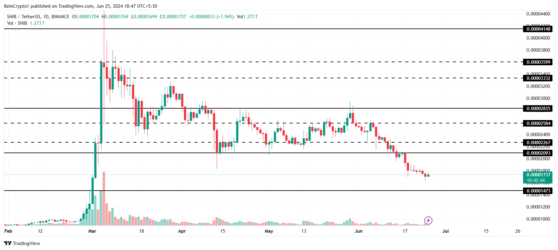 Aan de andere kant, als de daling doorzet, zou de meme coin kunnen dalen naar $0,00001473. Dit prijspunt markeert de kritieke bodem voor de Shiba Inu coin koers. Als deze steun verloren gaat, kan de bullish-neutrale Shiba Inu coin verwachting volledig worden ontkracht.