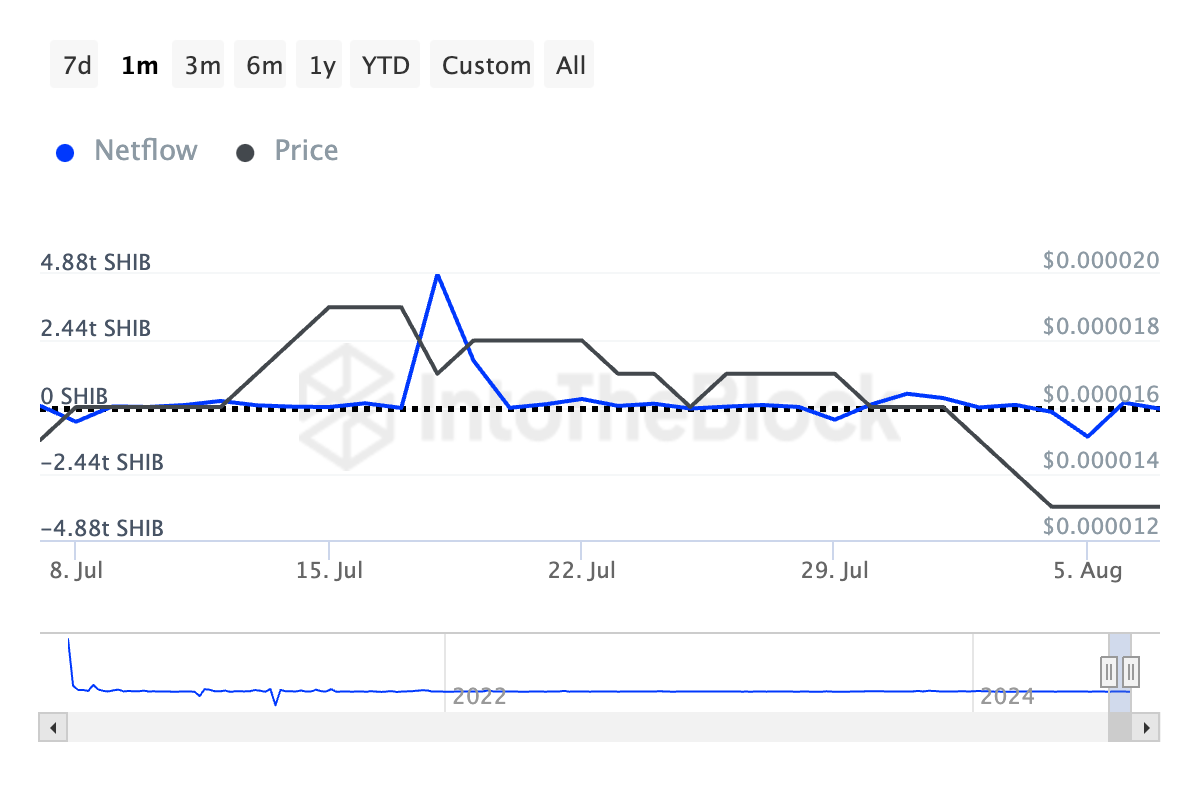 Verder bevestigt de afname in SHIB’s Large Holders’ Netflow dat whale-adressen meer hebben verkocht dan verzameld in de afgelopen maand. Volgens IntoTheBlock is SHIB’s Large Holders’ Netflow met 391% gedaald in deze periode.