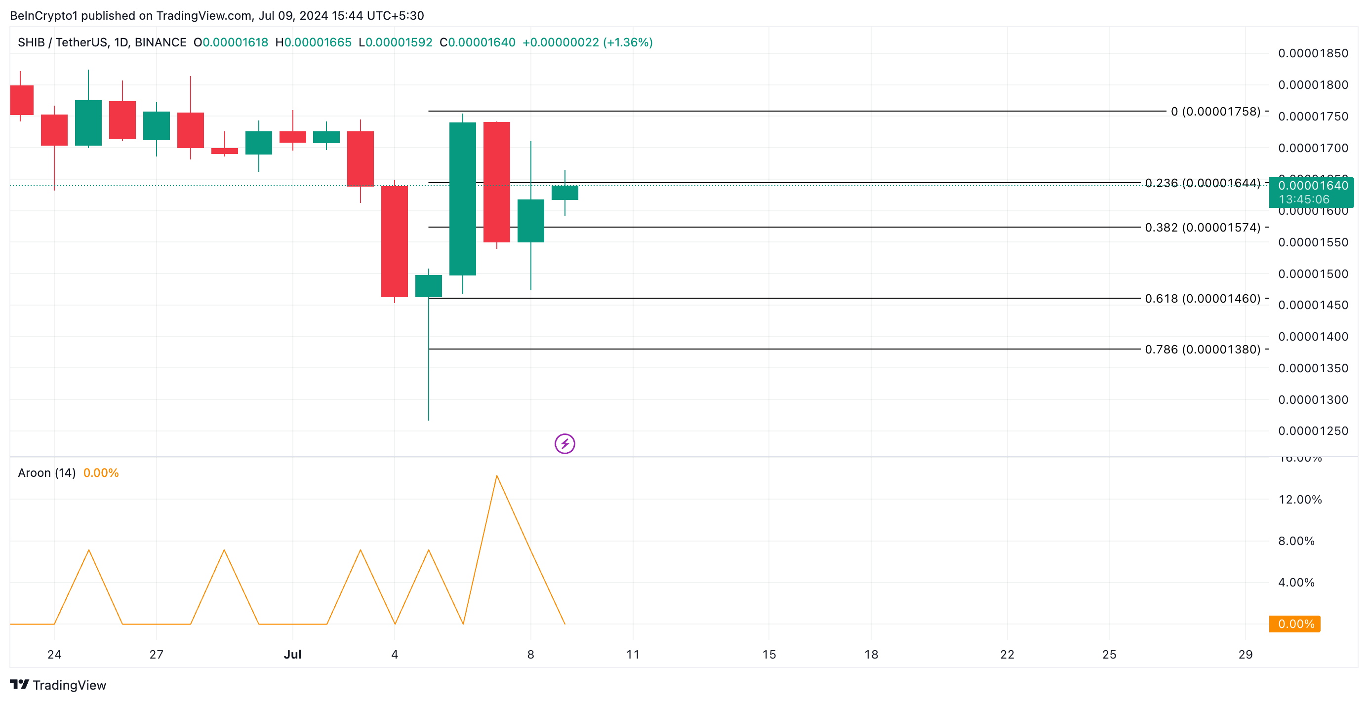 Volgens SHIB’s Aroon Up Line, waargenomen op de dagelijkse grafiek, zou de huidige koersrally van korte duur kunnen zijn. Op het moment van dit schrijven is de waarde van de indicator 0%.