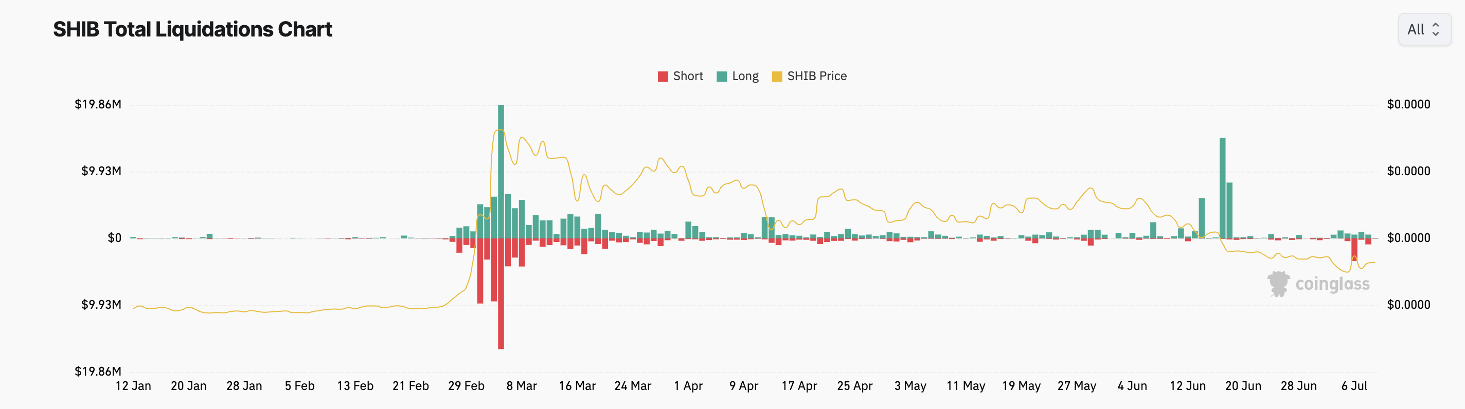 Sinds de koersstijging op 5 juli begon, registreerde SHIB meer short-liquidaties dan long-liquidaties. Op 6 juli bedroegen de long-liquidaties van SHIB in totaal $3,36 miljoen, een overschrijding van de long-liquidaties met maar liefst 491%. Dit waren SHIB’s hoogste dagelijkse short-liquidaties sinds 8 maart.