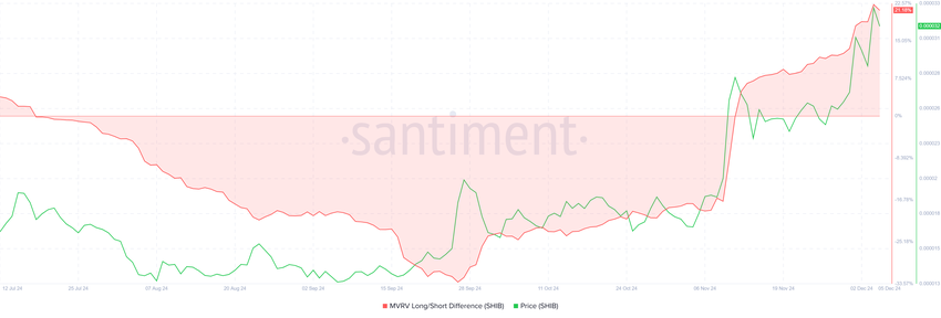 Het macro-momentum achter Shiba Inu is ook versterkt, zoals blijkt uit de MVRV (Market Value to Realized Value) Long/Short Difference. Deze metriek laat zien dat SHIB aanzienlijke steun heeft van long-term holders (LTH’s). Positieve MVRV-waarden suggereren dat deze investeerders winst maken, en aangezien ze de neiging hebben om hun posities vast te houden in plaats van te verkopen, is hun steun cruciaal voor de koersstabiliteit van SHIB.