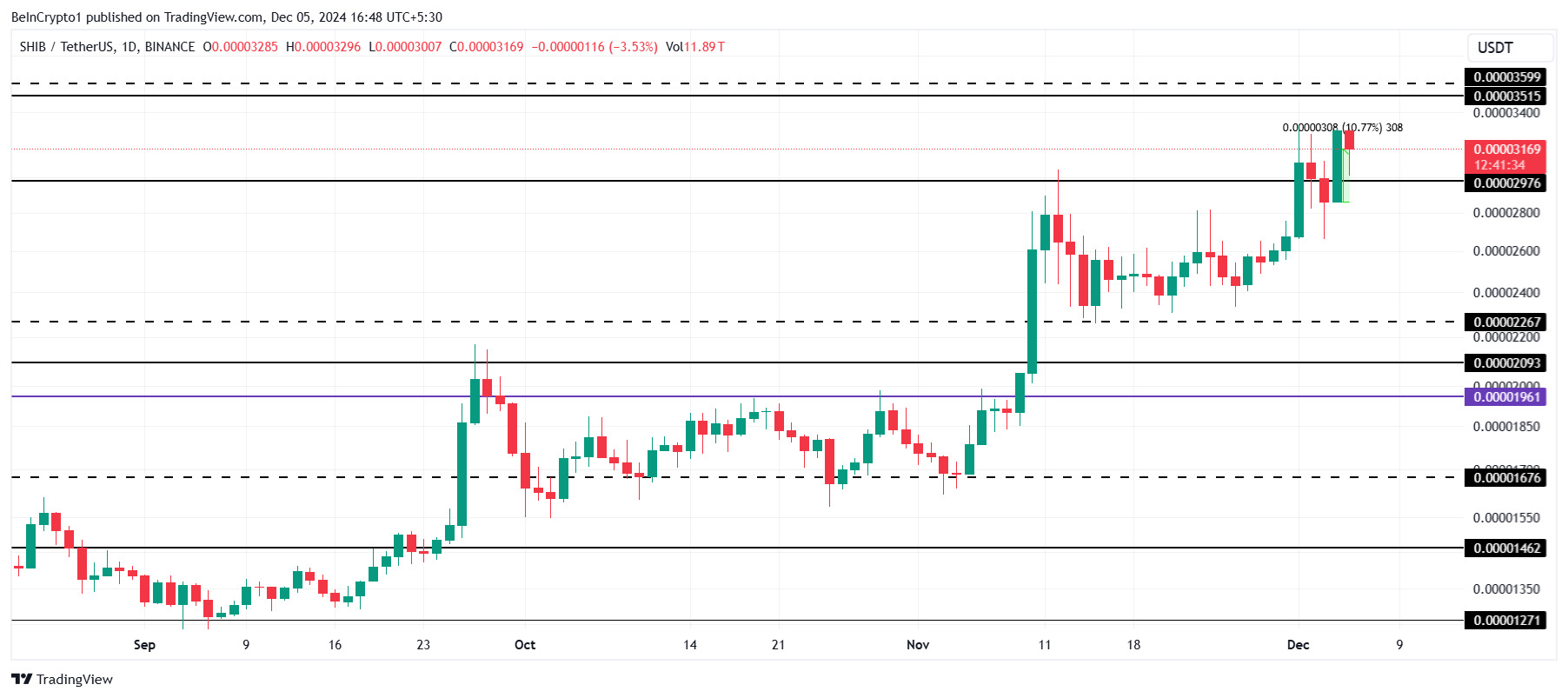 Echter, als SHIB zijn huidige steunniveau van $0,00002976 verliest, wordt een daling naar de volgende steunzone van $0,00002267 waarschijnlijker. Zo’n daling zou het bullish sentiment tenietdoen.