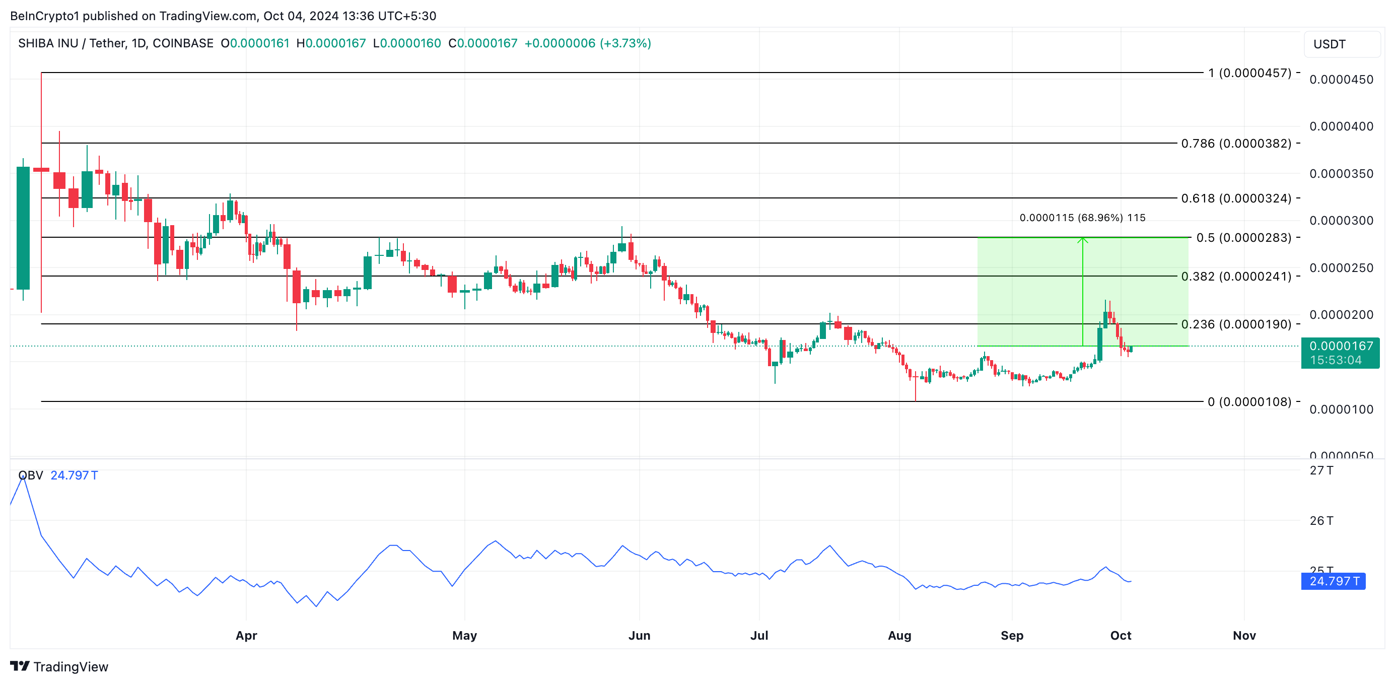 Een dalende OBV is typisch een bearish indicator, wat wijst op een potentiële neerwaartse koersbeweging. Wanneer dit gepaard gaat met een koersdaling, duidt dit op een gebrek aan koperssteun. Als de vraag naar SHIB blijft dalen, zou het zijn laagste punt van 5 augustus van $0,000010 kunnen herzien.