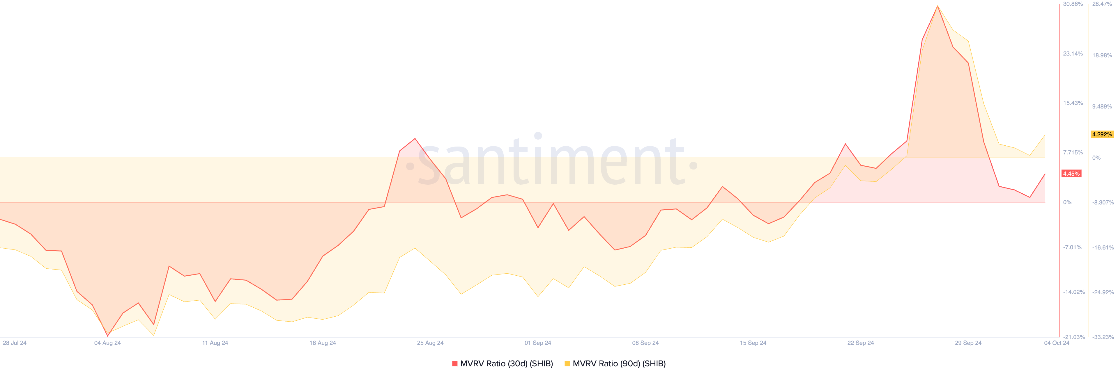 Deze groep grote SHIB-houders beheert nu 3,06 miljard SHIB, een toename van 2% van de 3,01 miljard SHIB die ze slechts een maand geleden hadden. Hun beslissing om meer tokens te verzamelen kan zijn ingegeven door de ondergewaardeerde status van SHIB gedurende september, zoals blijkt uit de verhouding tussen marktwaarde en gerealiseerde waarde (MVRV).