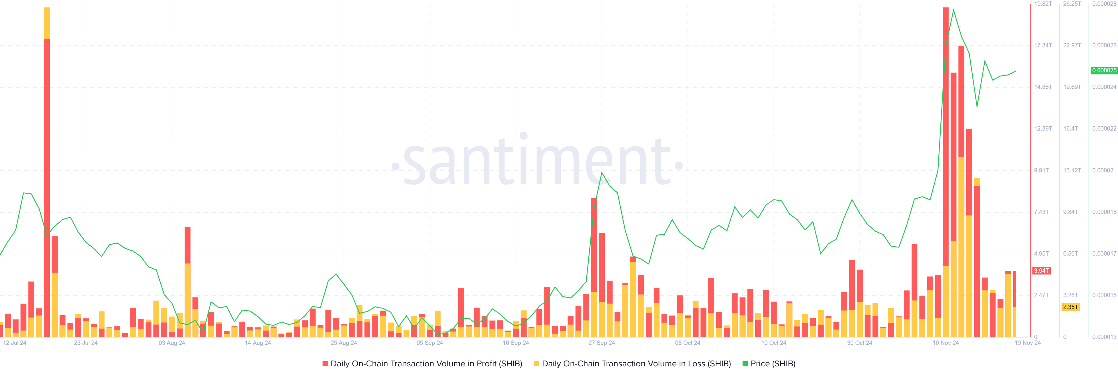 Naarmate verliezen afnemen en winsten beginnen te stijgen, kunnen de trends in transactievolume bullish worden. Gestabiliseerde prijzen trekken doorgaans het vertrouwen van investeerders aan, wat grotere activiteit in winstgevende transacties kan aanmoedigen. Deze verschuiving in het macro-momentum suggereert een mogelijk gunstig vooruitzicht voor het herstel van SHIB.
