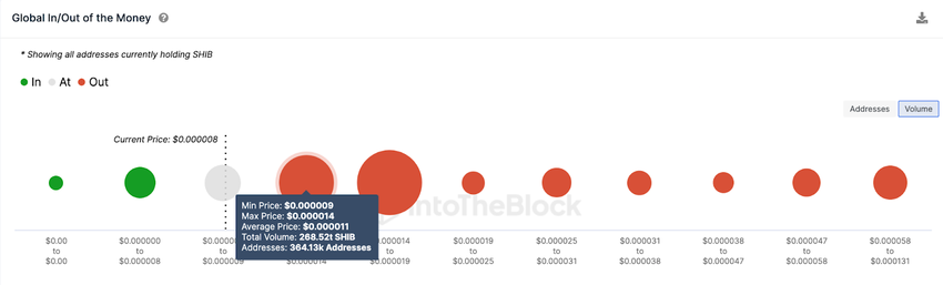 De Global In/Out of Money Around Price (GIOM)-gegevens, die de verdeling van de aankoopprijs van de huidige SHIB-houders laten zien, ondersteunen deze voorspelling ook.