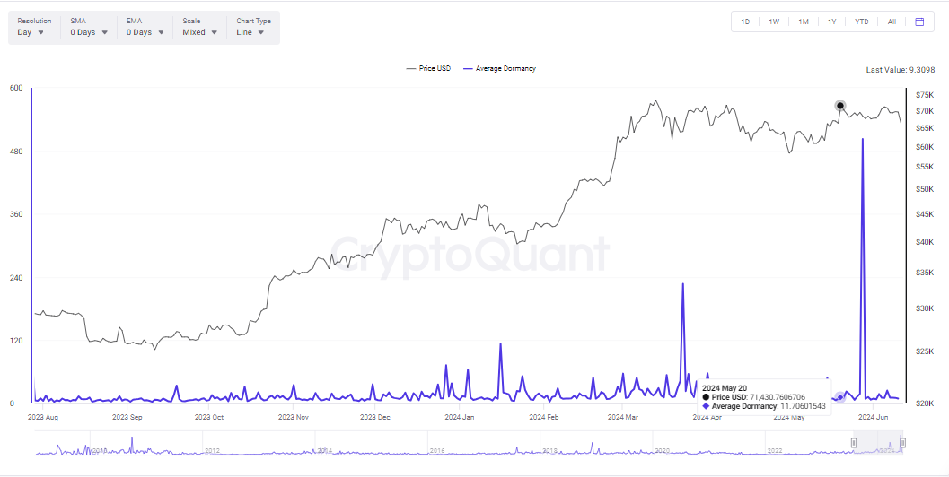 Data van CryptoQuant onthult dat op 10 juni de gemiddelde slapende Bitcoin 9,3098 was. Deze metriek toont het gemiddelde aantal vernietigde dagen van verplaatste coins, wat toeneemt wanneer langetermijn holders hun coins verplaatsen of verkopen, wat een signaal kan zijn voor een potentiële koersdaling.