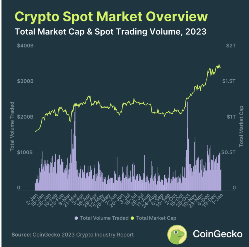 Een recent rapport van CoinGecko onthult dat het totale handelsvolume voor 2023 daalde tot ongeveer 70% van het niveau van het voorgaande jaar.