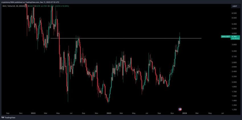 De Synthetix (SNX) koers is deze week aanzienlijk gestegen. Het bereikte een 600-daagse high van $4,95.